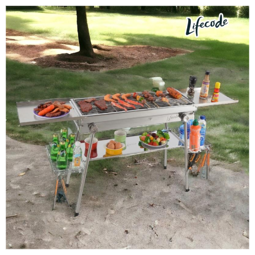 【LIFECODE】戰艦特大烤肉架(304不鏽鋼雙蓋煎盤+升降烤網+置物盤+籃子x2) 12410280