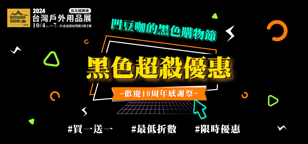 - 本活動頁非展場所有展出商品、優惠資訊,更多精彩展出內容與展場購物優惠,都在【2024台灣戶外用品展—台北經典場】現場!