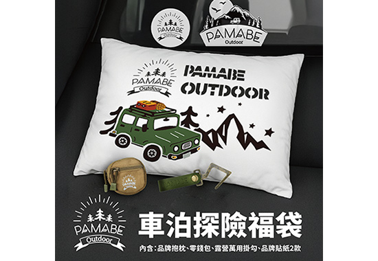 PAMABE Outdoor 車泊探險福袋,內含品牌休閒抱枕、露營機能圓形零錢包、露營萬用掛勾及品牌貼紙2款。抱枕輕巧舒適,可作午休枕、靠枕或腰枕,隨行支撐,方便攜帶;零錢包多功能收納,防潑水耐刮,輕巧便攜,適合露營、旅遊或日常使用;萬用掛勾耐用PU皮革材質,安裝簡單,鈕扣固定穩固;車貼耐曬防水防刮,不殘膠、不傷愛車,長效實用,是車泊露營愛好者的理想福袋。