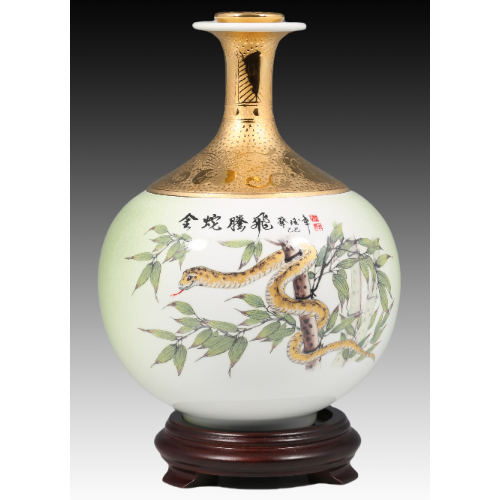賀木堂榮幸邀請「警界儒將」、「博士畫家」─蔡俊章博士,以行雲流水、融合獨特生命經驗的畫筆,為乙巳蛇年設計專屬的「金蛇騰飛」,並與台華窯合作,以獨特的「高溫釉下彩」,加上專利上釉工法,,將畫作「金蛇騰飛」騰躍瓶上,再以出色的雕金技藝,純手工於瓶蓋、瓶頸雕紋寓意吉祥及富貴的「蝴蝶」與「牡丹」,是為頂極工藝與藝術交織而成,生意盎然之作,值得收藏、增顯尊榮,繽紛永傳。