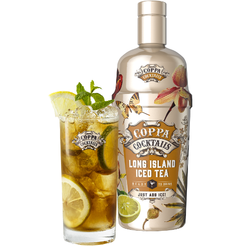 將Coppa長島冰茶雞尾酒直接從冰箱拿出倒入裝滿碎冰的長飲玻璃杯中,並用一片檸檬裝飾。