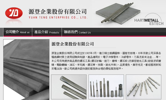 源登企業股份有限公司成立於1985年3月,進口瑞士鎢鋼圓棒、圓管及板塊。30年來敝公司深具各種鎢鋼材質之使用經驗與知識,產品適用於:電子沖模零件、冷鍛零件、刀具及粉末冶金...等,本公司另有提供高品質的鑽石工具(鑽石砂輪、銼刀、磨棒、鑽石粉)及精密拋光工具(超音波研磨機、電動轉軸、油石、羊毛氈、鑽石膏、棕刷、拋光木棒)。