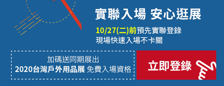 10/27(二)前預先實聯登錄,加碼贈送同期「2020台灣戶外用品展」免費參觀資格!