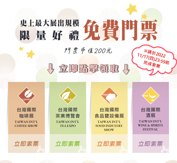 全台最大茶酒咖啡食品展!免費門票大方送(市價200元)!
